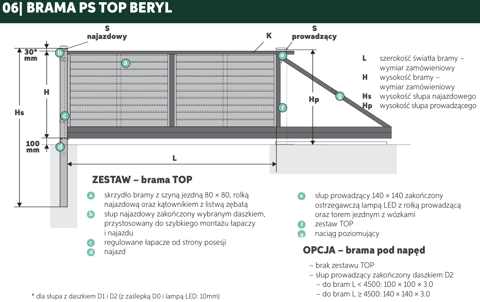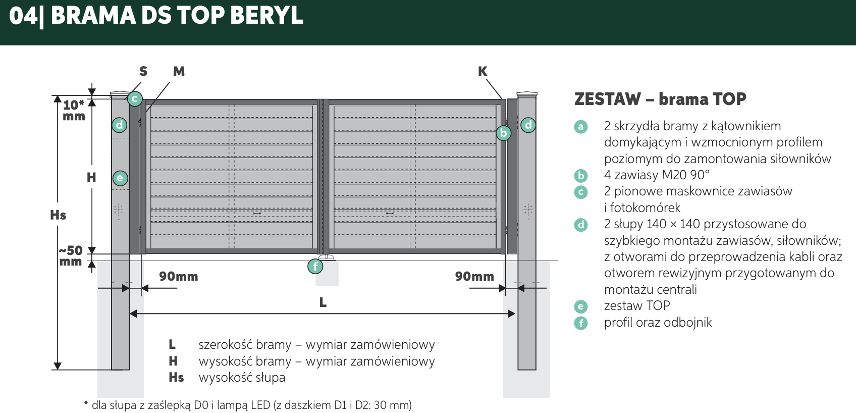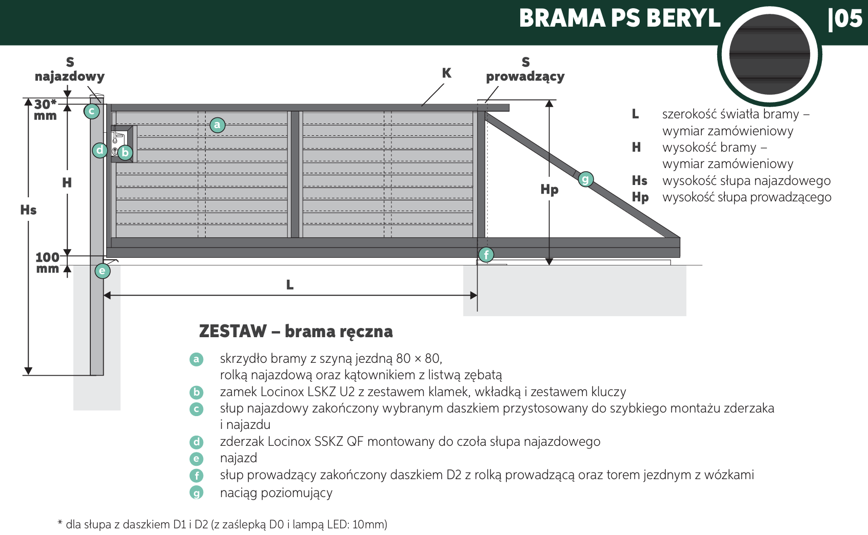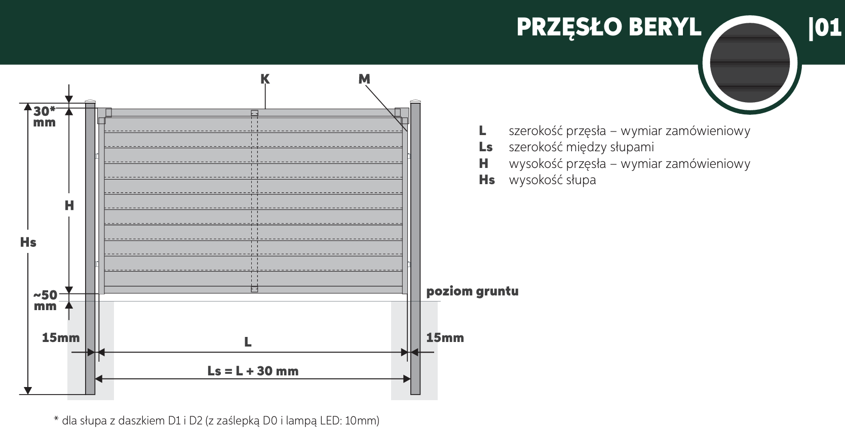 Do wyboru cztery rodzaje daszków (zaślepka D0, kula D1, koperta D2, LED), pasujące do słupów o przekrojach od 80 × 80 mm do 140 × 140 mm.