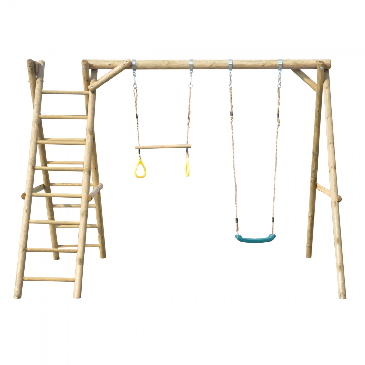 Huśtawka została wykonana z drewna sosnowego impregnowanego ciśnieniowo, co sprawia, że konstrukcja jest trwała i odporna na niekorzystne warunki atmosferyczne. W skład zestawu wchodzą: konstrukcja drewniana, siedzisko z tworzywa PCV, trapez, zestaw montażowy, instrukcja.