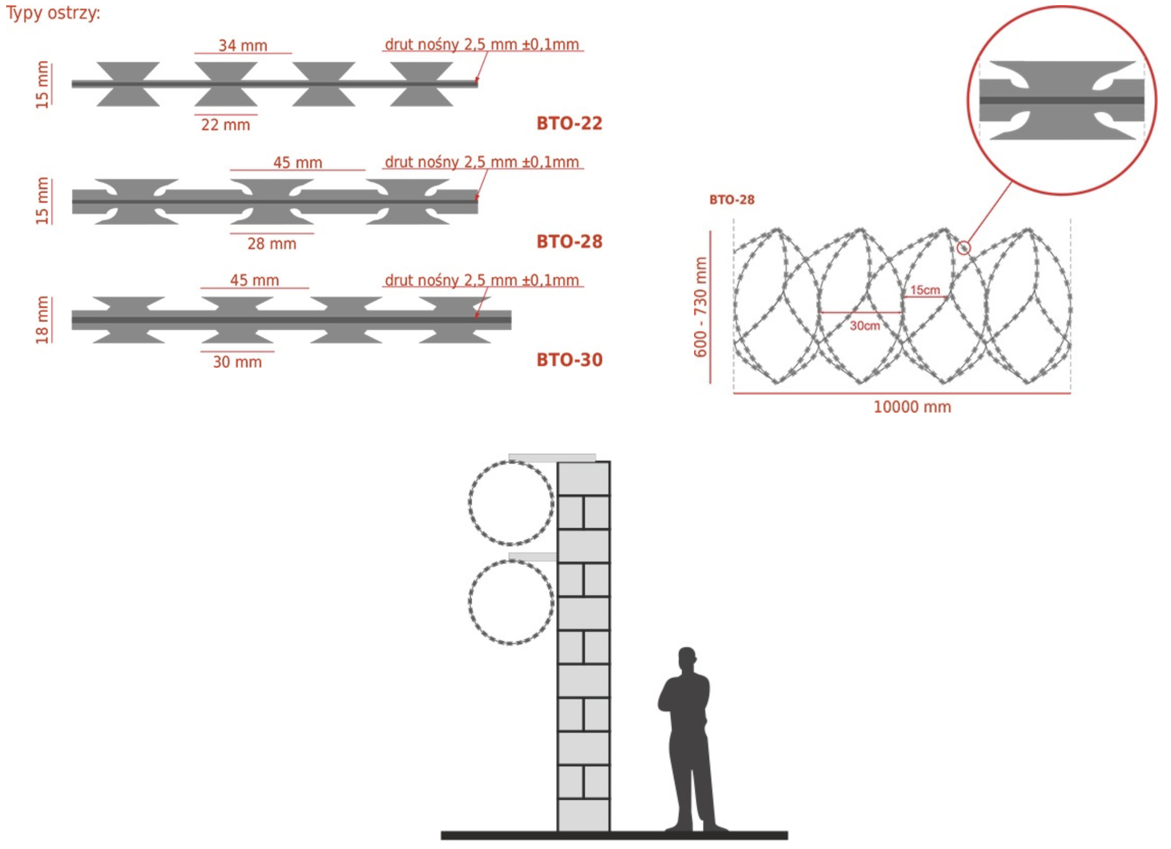 Koncertina 600 mm, 730 mm to ogrodzenie o wysokim współczynniku wytrzymałości na uszkodzenia mechaniczne, wykorzystywane do zabezpieczeń wygrodzeń wewnętrznych w miejscach o wzmożonej potrzebie ochrony, takich jak zakłady karne i areszty śledcze. Zasiek jest zawieszany wysoko na ogrodzeniu, najczęściej w dwóch rzędach, co szczególnie wpływa na jakość ochrony. Koncertina powstaje z drutu sprężynowego, na którym zamocowane są na całej długości specyficzne łączniki ze stalowej taśmy z wyciętymi otworami. Jest spięty w odpowiedni sposób złączkami, dzięki czemu spełnia funkcję agresywnego zabezpieczenia, nadając stabilną konstrukcję w kształcie walca. Wyposażony w zasiek przestrzenny o 54 zwojach. Dla średnic 600 i 730 mm stosuje się po 5 złączek na zwój.