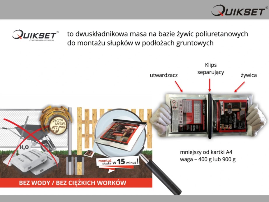 QUIKSET® jest przeszło 100x szybszy w montażu elementów w podłożu niż tradycyjna metoda z użyciem mieszanki betonowej. Już 6 minut po zaaplikowaniu QUIKSET® słupek jest pewnie zamocowany. Po kolejnych kilkudziesięciu minutach można go już bezpiecznie obciążać wieszając np. panele ogrodzeniowe.