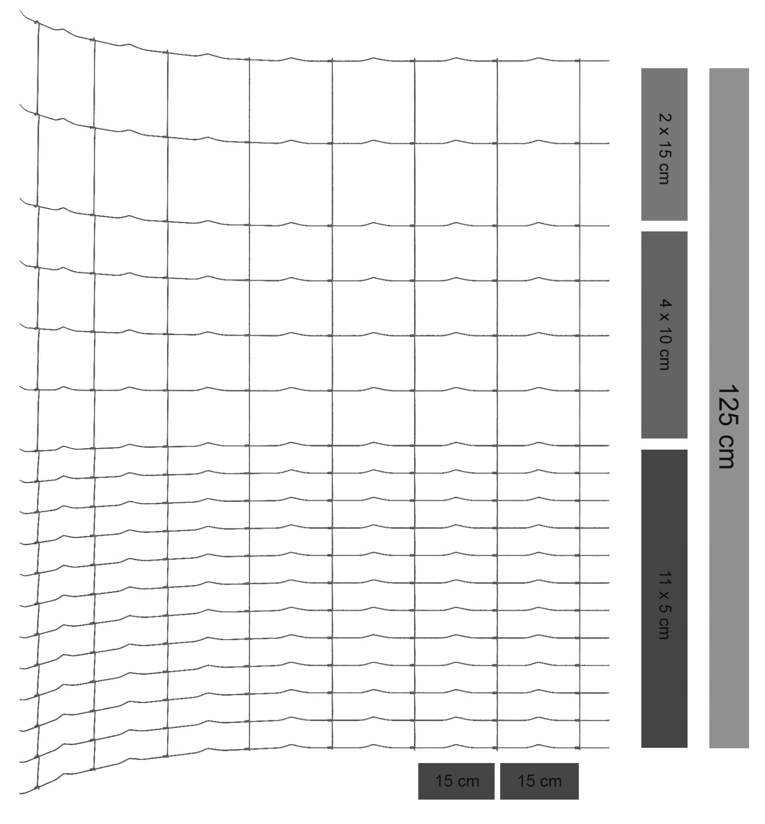 rozstaw drutów poziomych : 2 x 15 cm, 4 x 10 cm, 11 x 5 cm