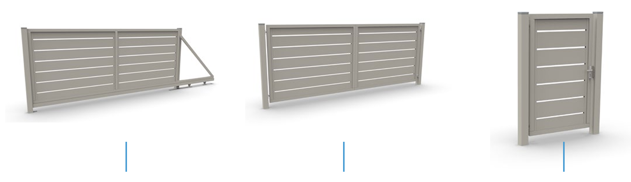 Elementy w zestawie z bramą przesuwną: Profil jezdny, rama, wypełnienie, wózki, uchwyt najazdowy, rolka prowadząca, słupy, uchwyt górny