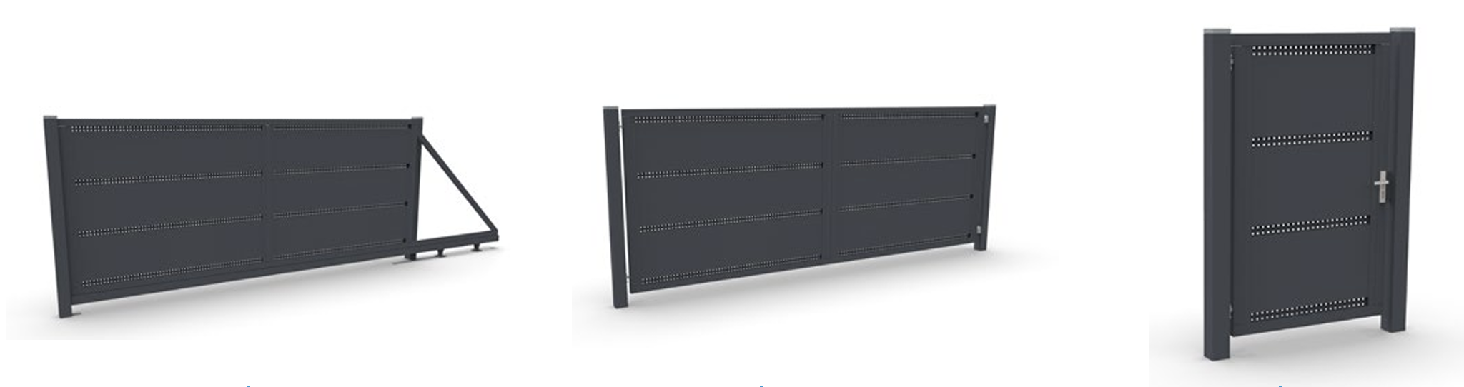 Elementy w zestawie z bramą przesuwną: Profil jezdny, rama, wypełnienie, wózki, uchwyt najazdowy, rolka prowadząca, słupy, uchwyt górny