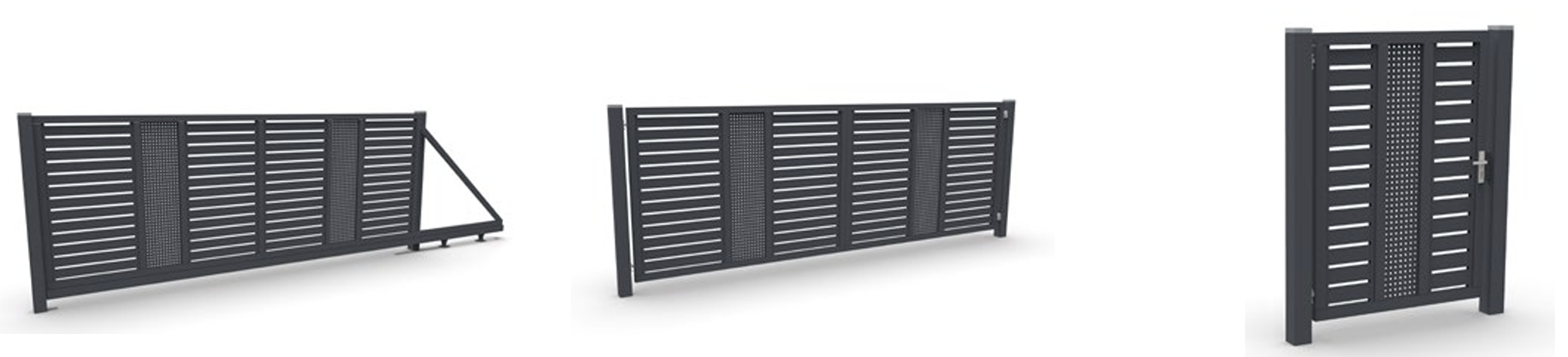 Elementy w zestawie z bramą przesuwną: Profil jezdny, rama, wypełnienie, wózki, uchwyt najazdowy, rolka prowadząca, słupy, uchwyt górny