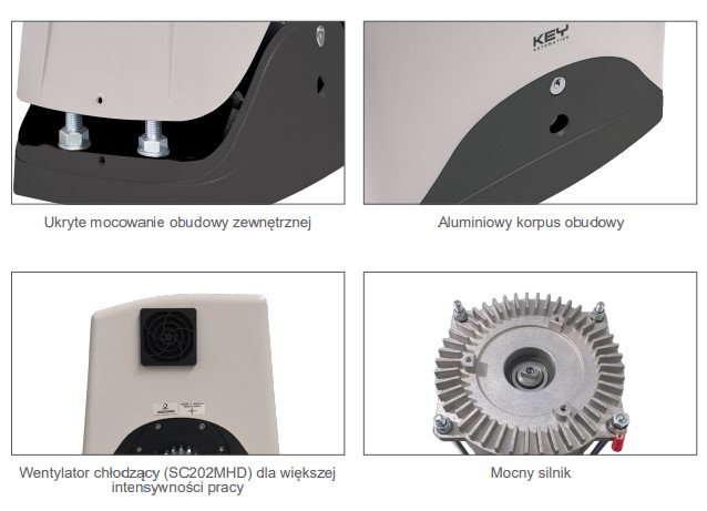 Obecnie motoreduktor SC202MHD w wersji standardowej wyposażony jest w hamulec elektromechaniczny Łatwa konserwacja dzięki centrali sterującej w pozycji poziomej Nowa wersja z wentylatorem chłodzącym dla większej intensywności pracy Centrala sterująca CT102B z wbudowanym wyświetlaczem Elementy elektroniczne i mechaniczne dobrze zabezpieczone przed czynnikami zewnętrznymi